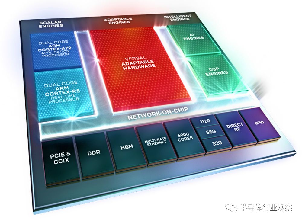 自从Xilinx从2018年发布ACAP架构以来,该架构就得到了行业的高度关注。ACAP全称“灵活计算加速平台”(Adaptive Computation Acceleration Platform),该芯片不仅包含了FPGA的可配置逻辑,还包含了ARM核,以及AI Engine和DSP Engine。这意味着使用ACAP架构的芯片将可以满足三种需求:ARM核可以运行一些通用化且对性能需求不高的任务,例如操作系统;FPGA可配置逻辑可以运行定制化逻辑;而AI Engine则可以运行AI相关的高性能专用计算,例如矩阵运算等。